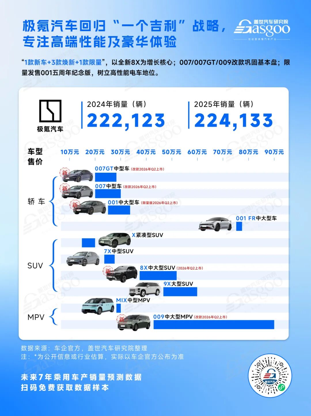 极氪以900V高压 + 超级电混为核心,通过高端产品矩阵 + 全球化布局,已从中国高端电动品牌成长为全球豪华智能电动的重要力量。2026年是其技术落地、矩阵闭环、全球化攻坚的关键年,有望进一步巩固在市场的领先地位,并向全球豪华品牌阵营发起冲击,盖世汽车研究院预计全年销量有望达到40万辆。