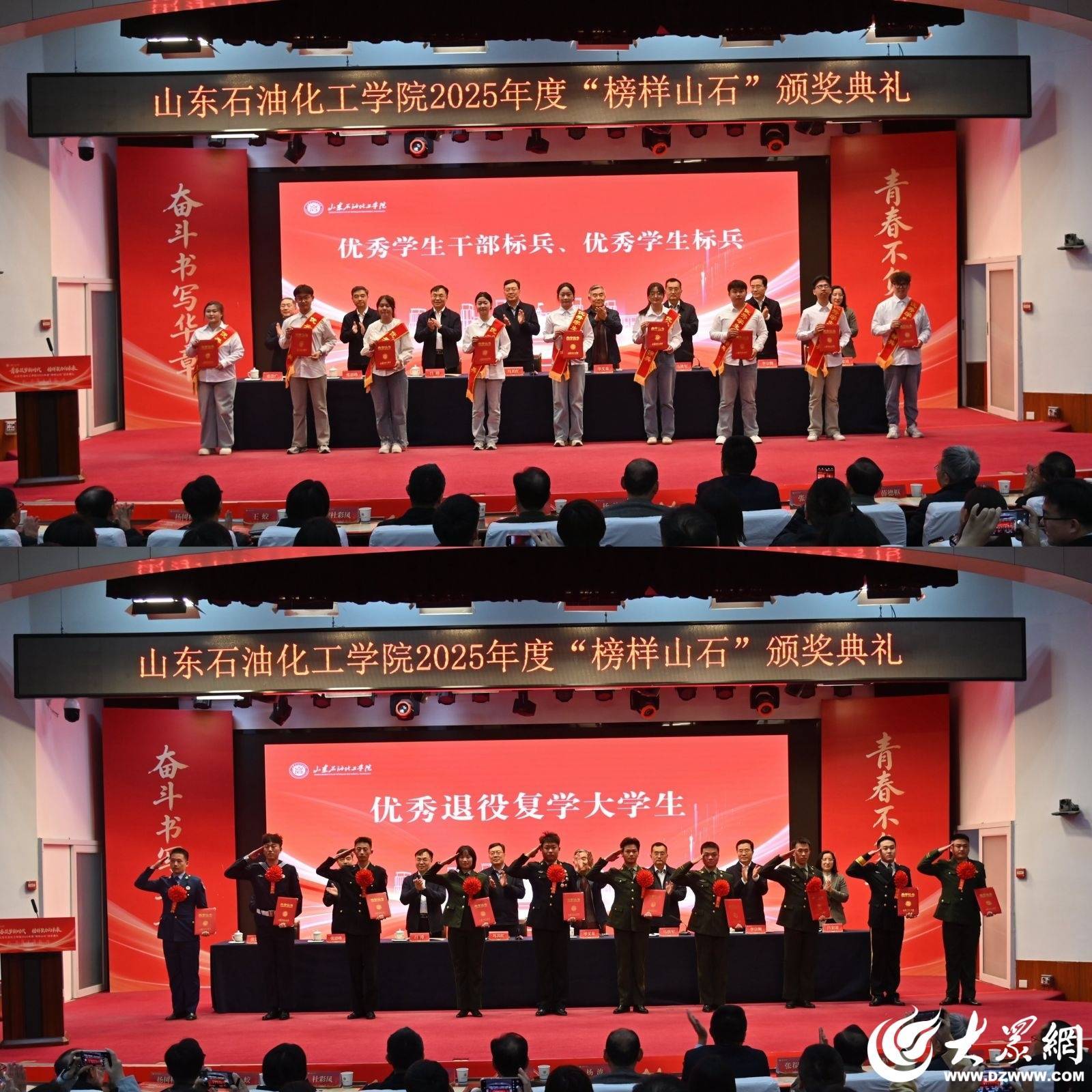 全体校领导班子出席颁奖典礼,相关部门单位主要负责人、全体辅导员、获奖学生以及2025级各学院学生代表参加典礼。典礼开始前,全体师生共同参观了“青年榜样事迹展”,观看了青春励志宣传片《以奋斗致最美青春》。