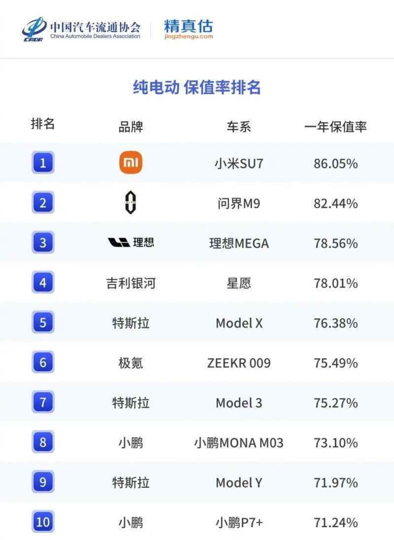 与此同时,连保值率,小米 SU7 都是纯电车型里的前排水平。