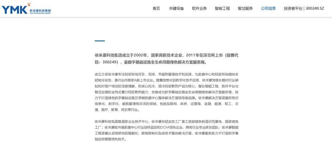 依米康科技集团成立于2002年,国家高新技术企业,2011年在深交所上市(股票代码:300249),是数字基础设施全生命周期绿色解决方案服务商。