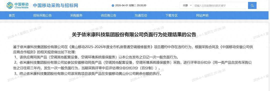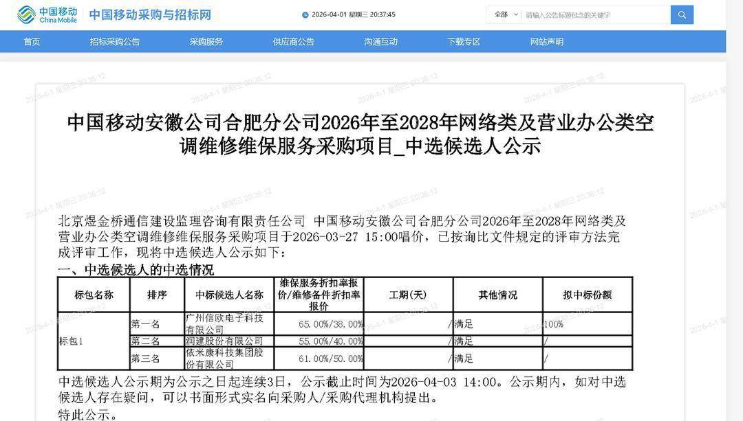 3月31日,中国移动采购与招标网发布中国移动安徽公司合肥分公司2026年至2028年网络类及营业办公类空调维修维保服务采购项目中选候选人公示,依米康排在第三位,未能中标。